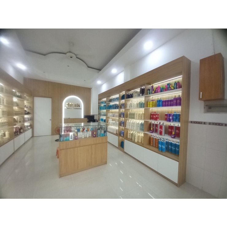 Showroom Mỹ Phẩm Helen Q6 tọa lạc tại Quận 6, TP. Hồ Chí Minh, là một ví dụ điển hình về sự kết hợp hài hòa giữa thẩm mỹ hiện đại và công năng trưng bày sản phẩm tối ưu. Với sự hiểu biết sâu sắc về hành vi khách hàng trong ngành mỹ phẩm, Nội thất Thức Nguyễn đã thiết kế một không gian mở, sử dụng tông màu gỗ sáng ấm (như trong ảnh ej.jpg, ek.jpg) kết hợp với màu trắng tinh khôi. Sự lựa chọn này không chỉ mang lại cảm giác sang trọng, gần gũi mà còn làm nổi bật sắc màu rực rỡ của các sản phẩm mỹ phẩm được trưng bày (ảnh eg.jpg).