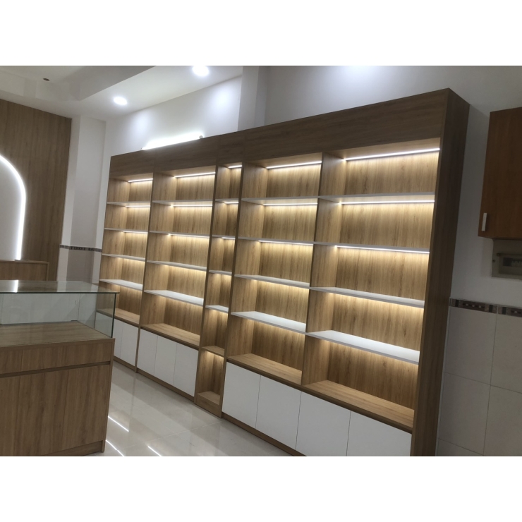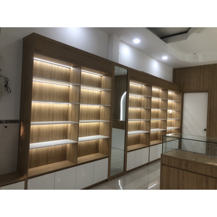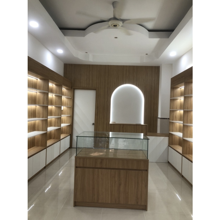 Hệ thống kệ sát tường cao và dài là điểm nhấn trung tâm của Showroom Mỹ Phẩm Helen Q6. Nội thất Thức Nguyễn đã sử dụng vật liệu gỗ công nghiệp cao cấp, bề mặt phủ Melamine chống trầy xước và chống ẩm, đảm bảo độ bền vượt trội trong môi trường kinh doanh liên tục.